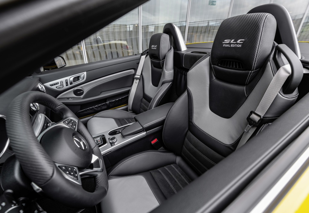 En el interior llaman la atención el tapizado en cuero bicolor negro/plata pearl con costuras de adorno en color de contraste gris alpaca, los cinturones de seguridad en gris alpaca y las aplicaciones de cuero de efecto carbono. El volante AMG Performance se caracteriza por segmentos revestidos en cuero con grabado tipo fibra de carbono arriba y bajo, así como una zona de apoyo de las manos en napa. Además, incorpora una marca gris cristal en la posición «12 h» y una placa adicional «AMG EDITION» en la moldura. La AMG Final Edition incluye para el SLC 43 numerosas funciones de confort del modelo de serie, como calefacción integrada en los reposacabezas AIRSCARF, calefacción del asiento del conductor y del acompañante y paquete de memorias para guardar los ajustes de los retrovisores exteriores, los asientos y la columna de dirección.