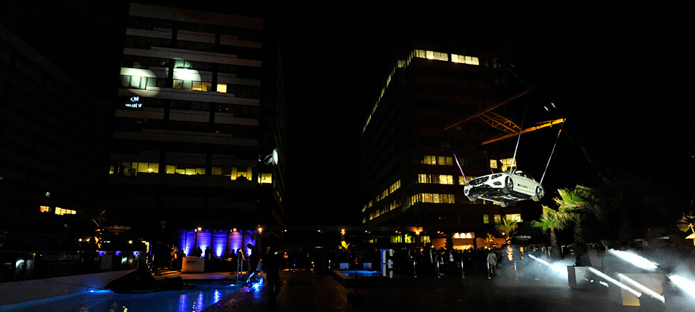 Después del espectáculo marítimo para los nuevos SUV’s de la marca alemana el otoño pasado, sólo nos faltaba llegar por los aires. Los asistentes se sorprendieron en un primer tiempo con la cantante deslizándose desde la 15ª planta del Hilton, para luego ver aparecer el nuevo Clase E encima de la piscina del Puro Beach simulando que bajaba del cielo. Pero no acabó allí, una saxophonista tocando junto al coche se veía recoger por un flyboard acompañando la música de David Guetta.